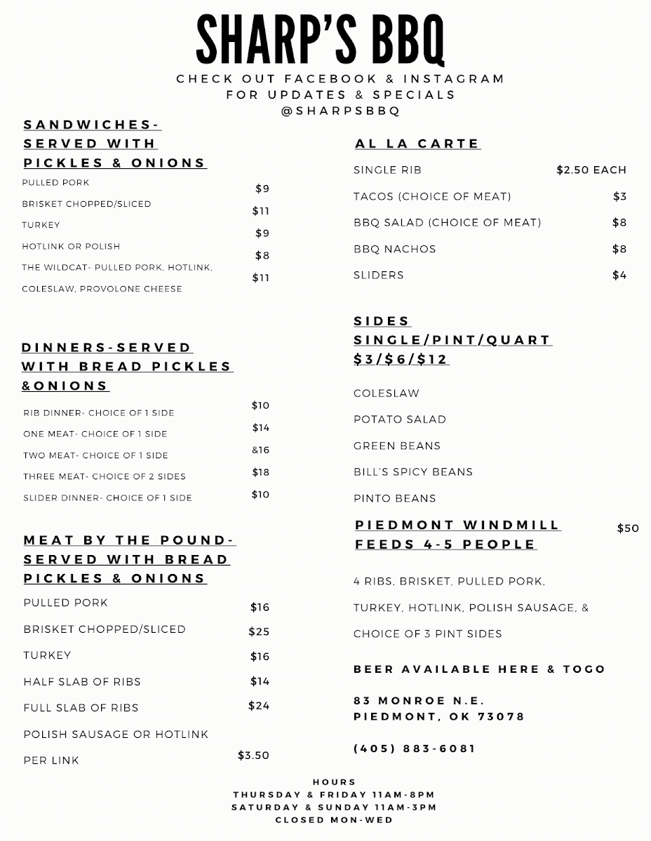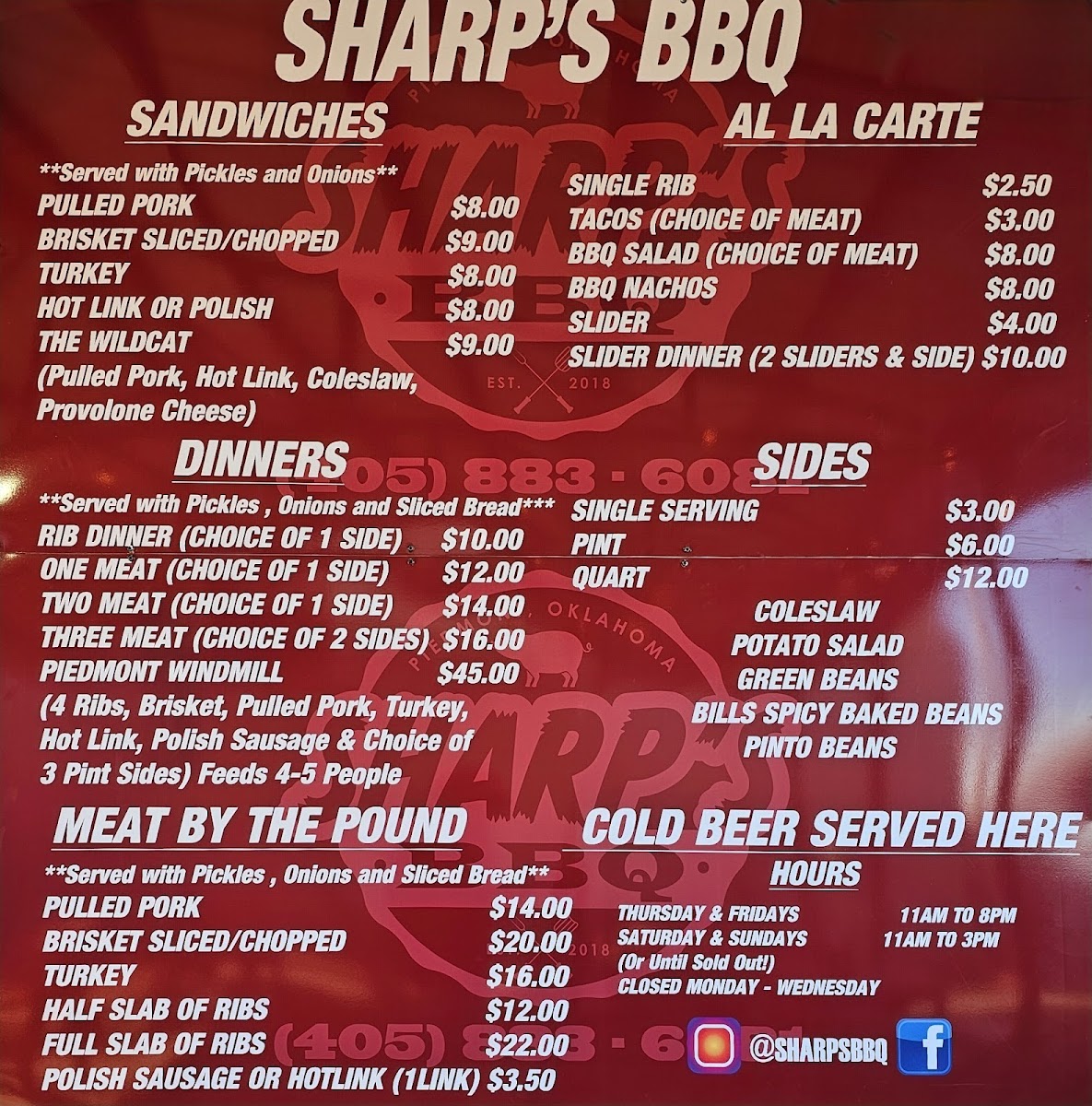 Sharp’s BBQ offers a straightforward, approachable menu centered around classic barbecue dishes served in a relaxed, casual setting. The focus is on hearty plates and sandwiches that invite lingering over good food and company. Whether stopping by for a quick lunch or gathering with friends on the roomy patio, the menu suits moments when comfort and simplicity matter most.